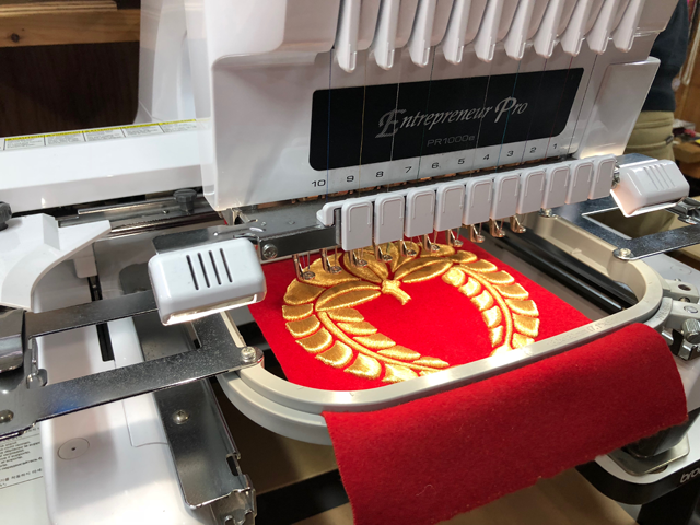 生地に、糸で文字やマークを縫い付けます。糸は金・銀をはじめ、300色以上ご用意しております。刺繍は洗濯をしても劣化しにくく、立体感があるため存在感を出すことができます。