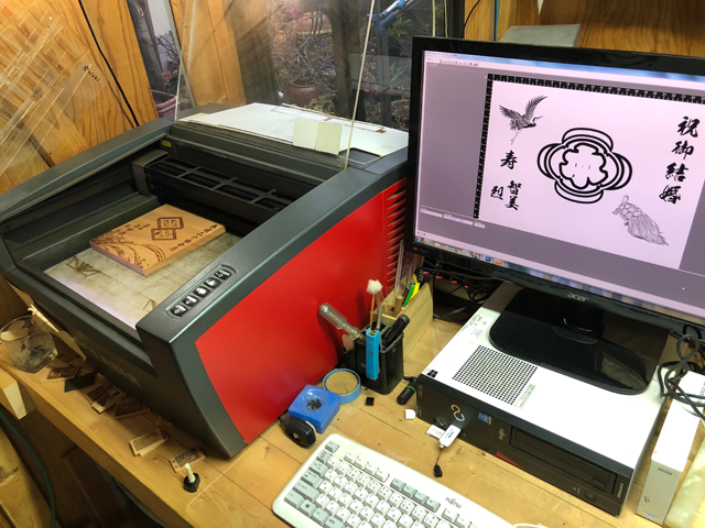 レーザ加工とは、レーザ光を照射した際の熱エネルギーにより、対象物を融解・蒸発させる加工方法のことです。レーザ光は集光性と指向性に優れているため、微細な加工にも最適です。木材、皮革などの製品に、レーザー加工(刻印加工、レーザーカットなど)を施し、文字・家紋入れなどを行います。